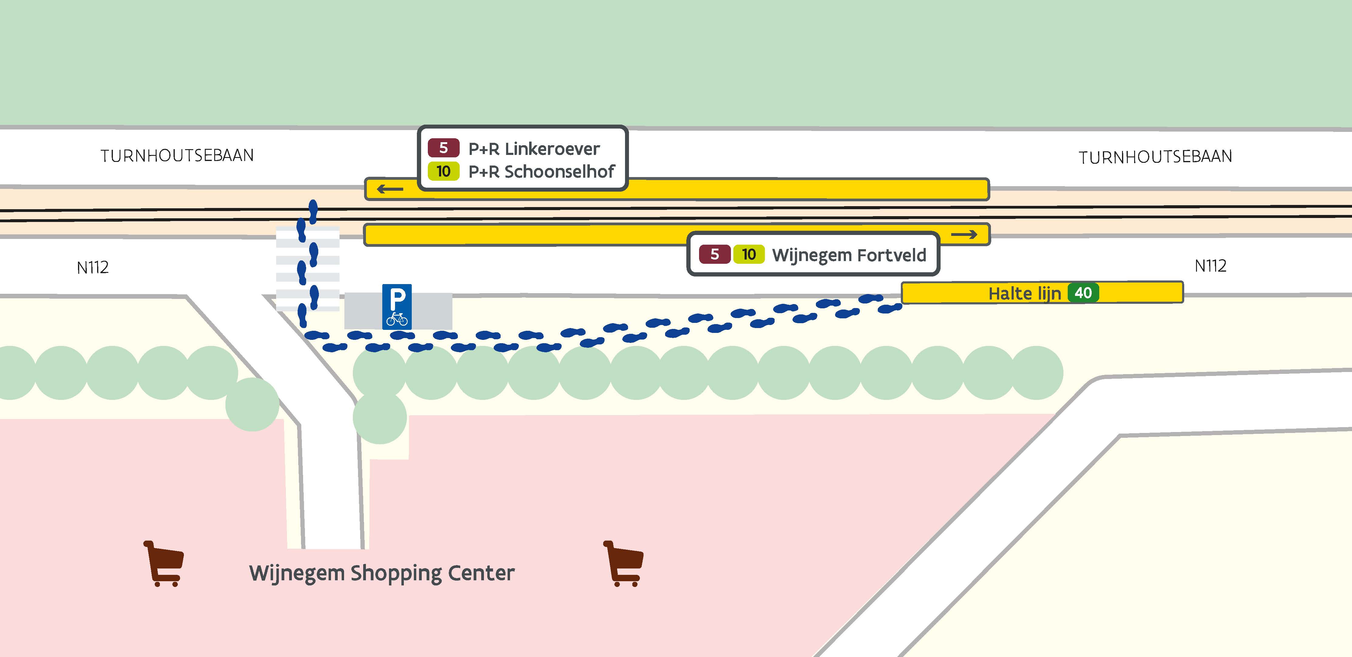 Take tram line 5 or 10 at Antwerpen Astrid Metro stop to Wijnegem Fortveld stop. Switch there to line 40 at the temporary bus stop Wijnegem Fortveld.