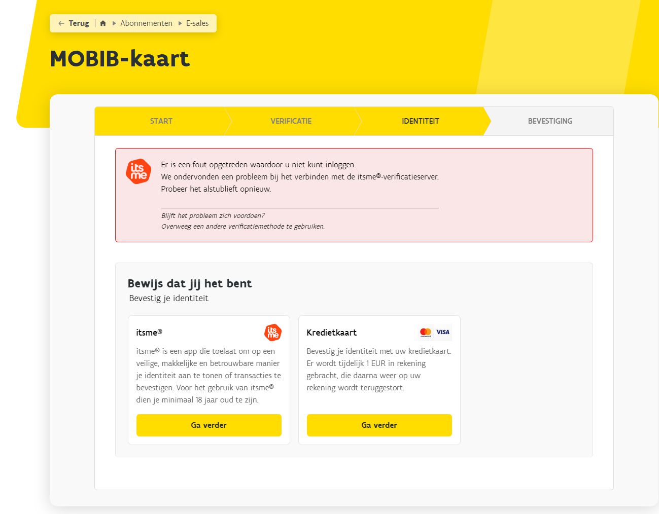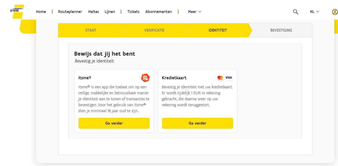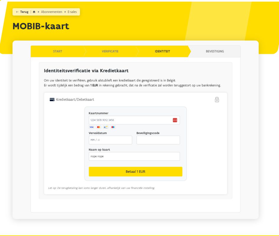 Door je op de ‘Verifieer Mijn MOBIB-kaart’-knop te doen klikken. Je komt dan terecht op een webpagina die héél erg lijkt op onze website. Je moet er je persoonsgegevens invullen en je identiteit bevestigen. Dat laatste zou via itsme verlopen, maar dat werkt bewust niet.