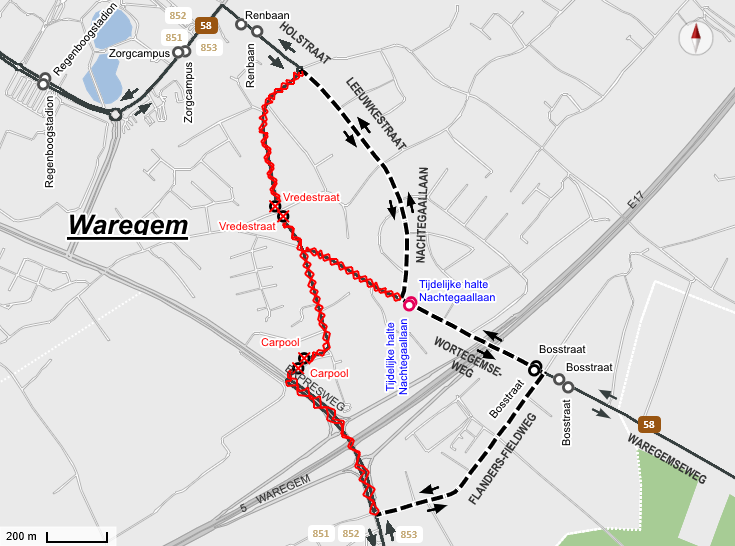 Door langdurige wegenwerken in de Franklin Rooseveltlaan volgen de buslijnen 58, 851, 852 en 853 vanaf 6 mei 2024 voor een lange tijd een alternatieve reisweg bij in- en uitrijden van Waregem.